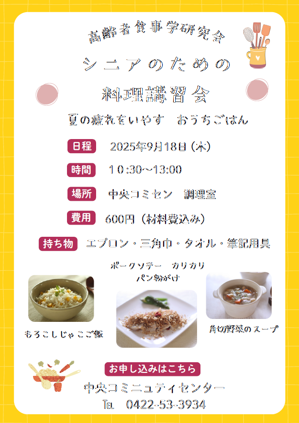 中央コミセンにてシニア対象の料理講習会開催(第1回 5月13日 第2回 9月18日)