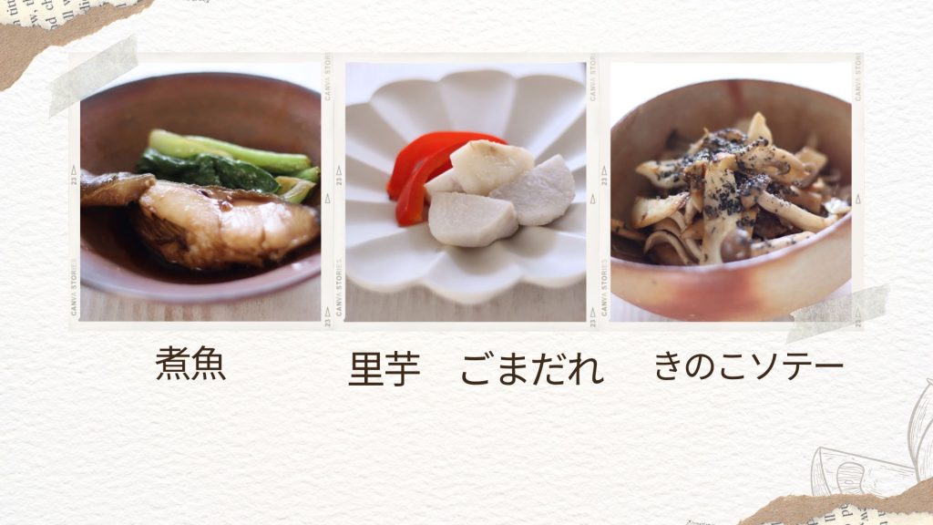 no.23 秋野菜を使って、簡単料理! Post in 2025年09月25日 in ☆開催日9月25日 ☆献立・五穀米・煮魚・里芋のごまだれ添え・いろいろきのこのソテー☆実習本日はきのこを使った料理、煮魚のリクエストがあったので、きのこを取り入れたレシピも紹介。