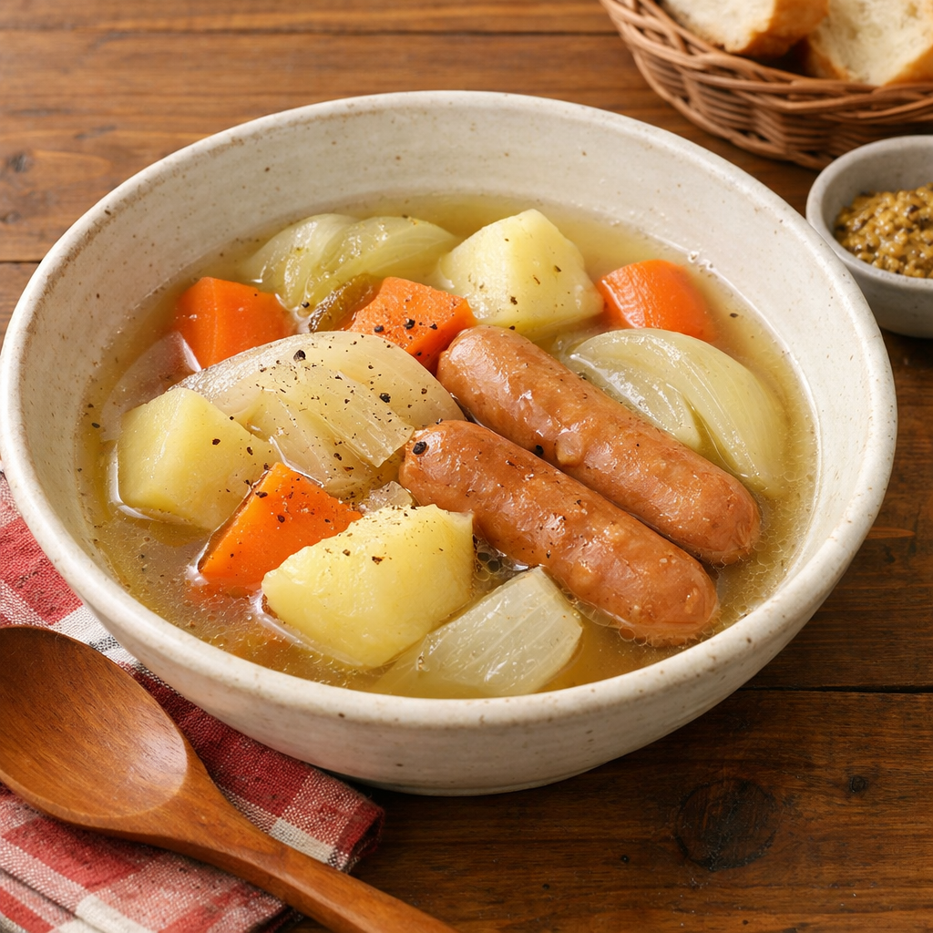開催日 2月25日献立 主食 ガーリックライス 汁&副菜 重ね煮のポトフ 主菜 ポークのカレー風味ピカタ